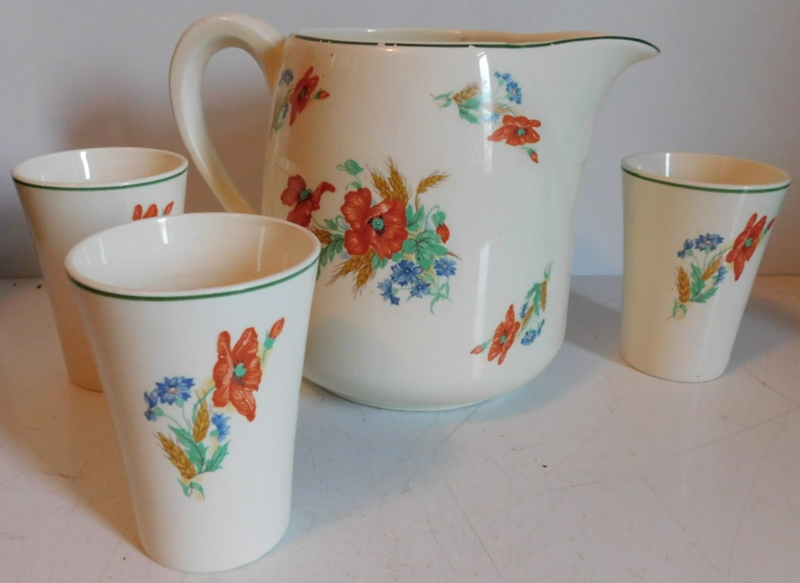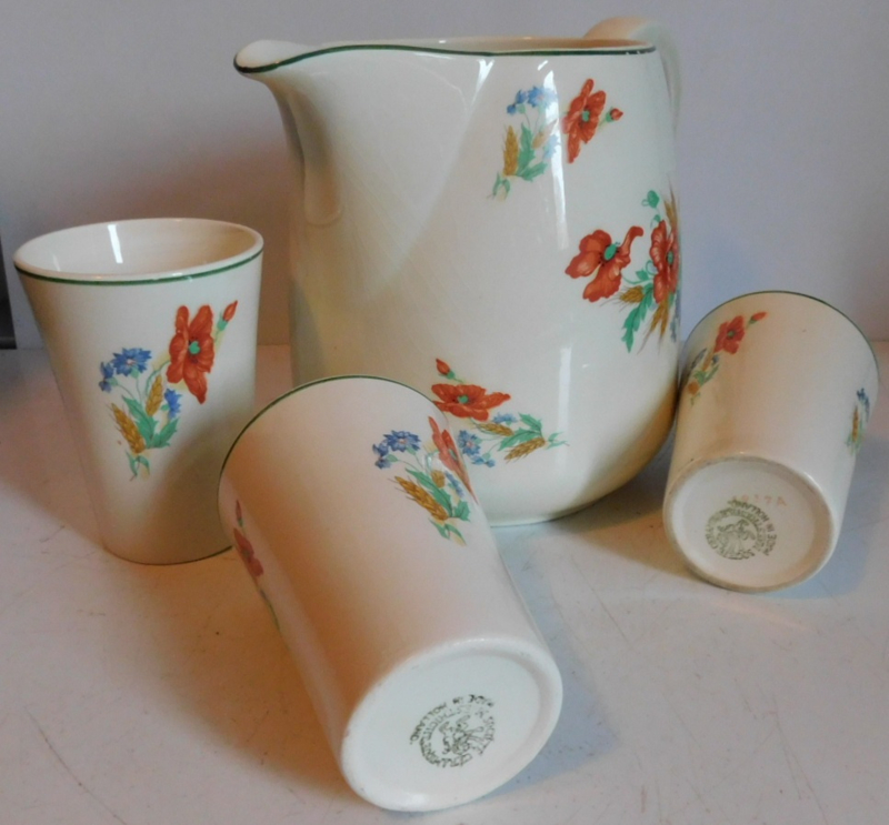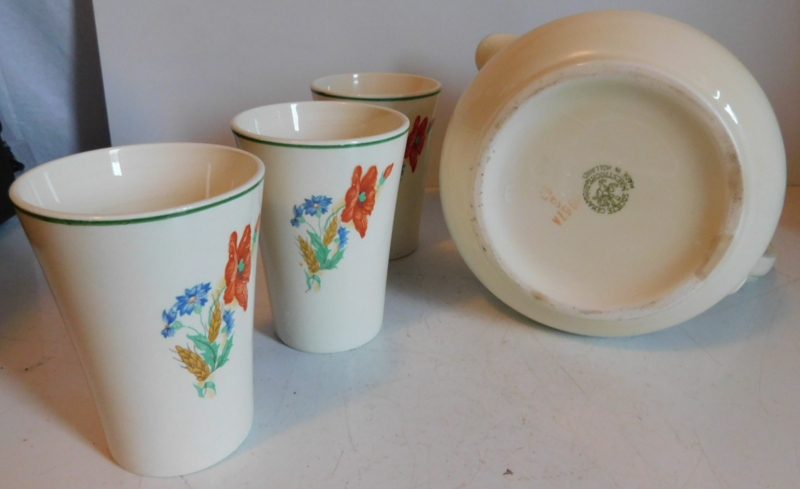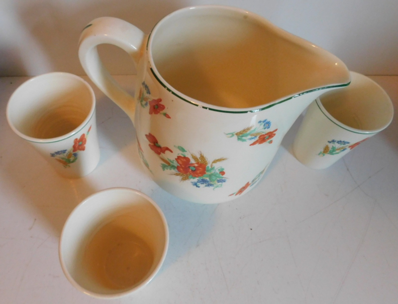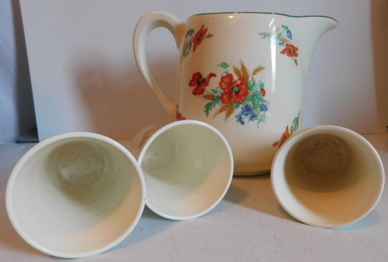 Artikelnummer: Grunn1275- Société Céramique crèmekleurige melkkan + 3 Bekers met florale Klaproos decoratie.